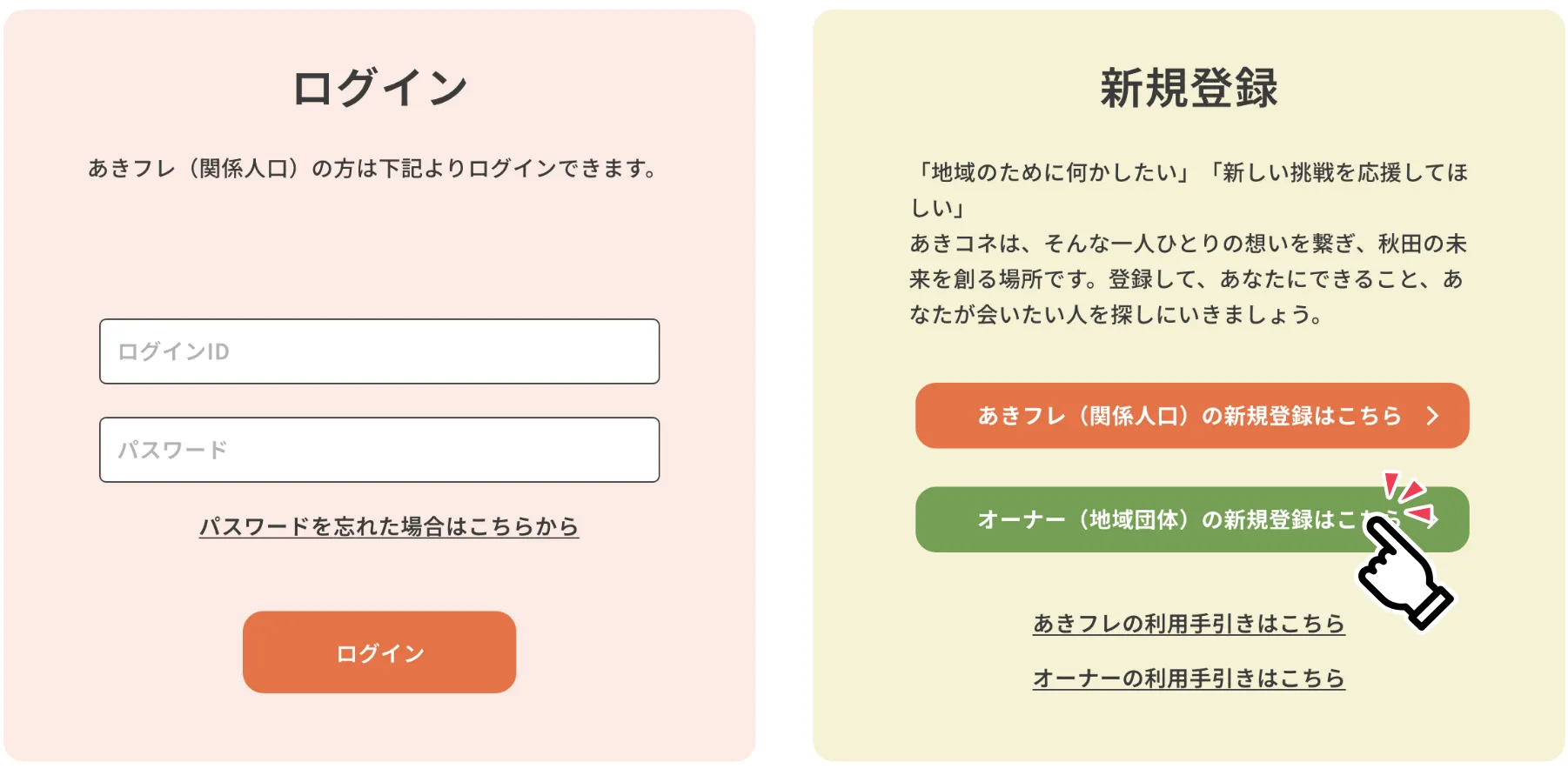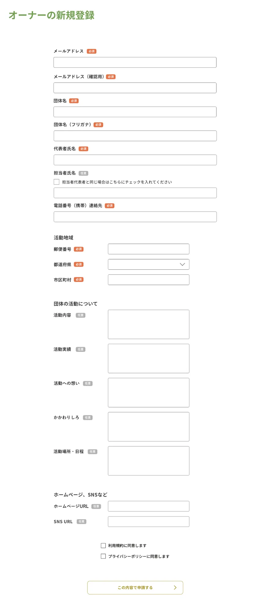 「オーナー(地域団体)の新規登録はこちら」をクリックしてして、フォーム内の必須項目を入力し、送信してください。