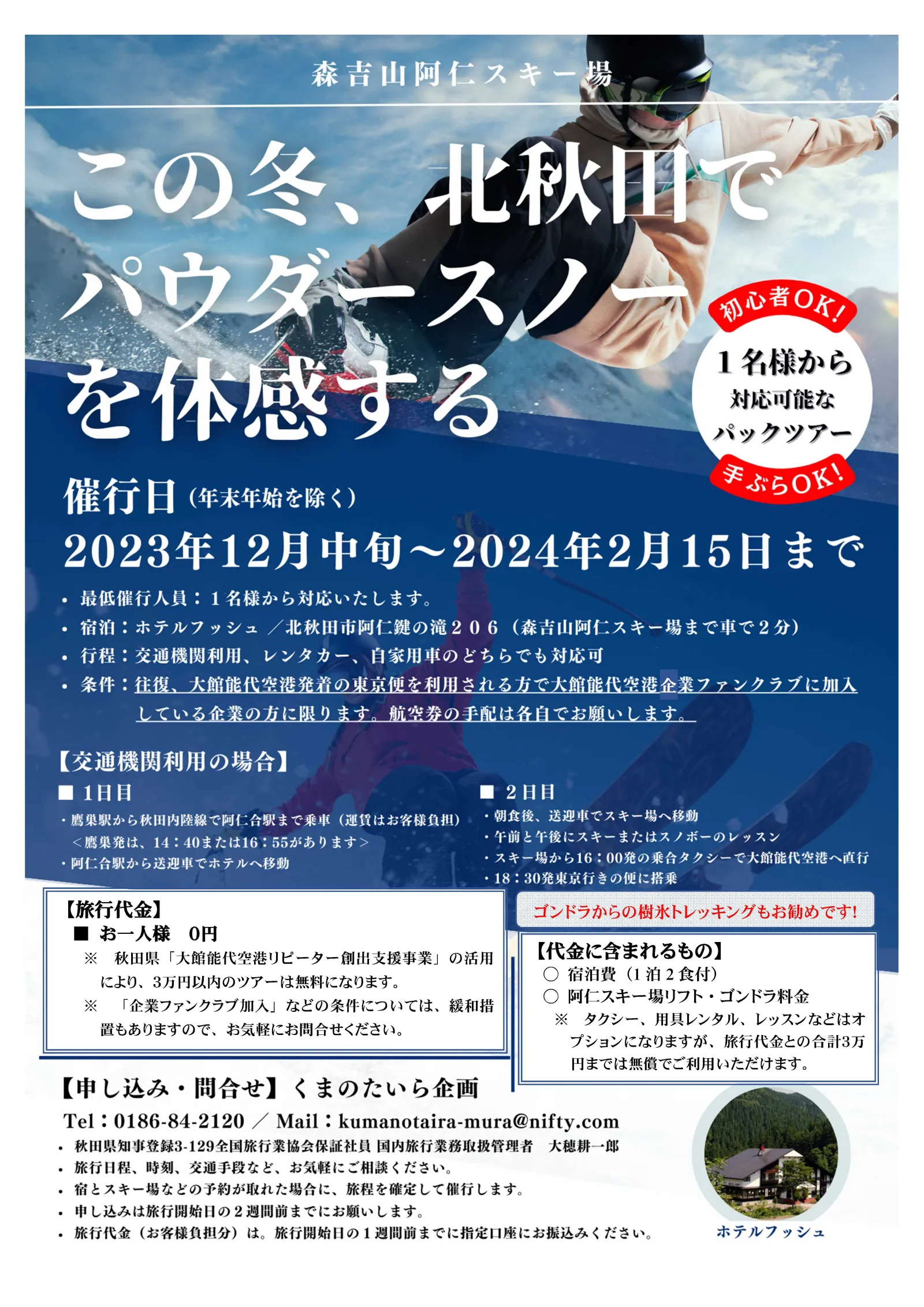 代 金:お一人様0円(1泊2食付宿泊費、阿仁スキー場リフト・ゴンドラ料金を含む)