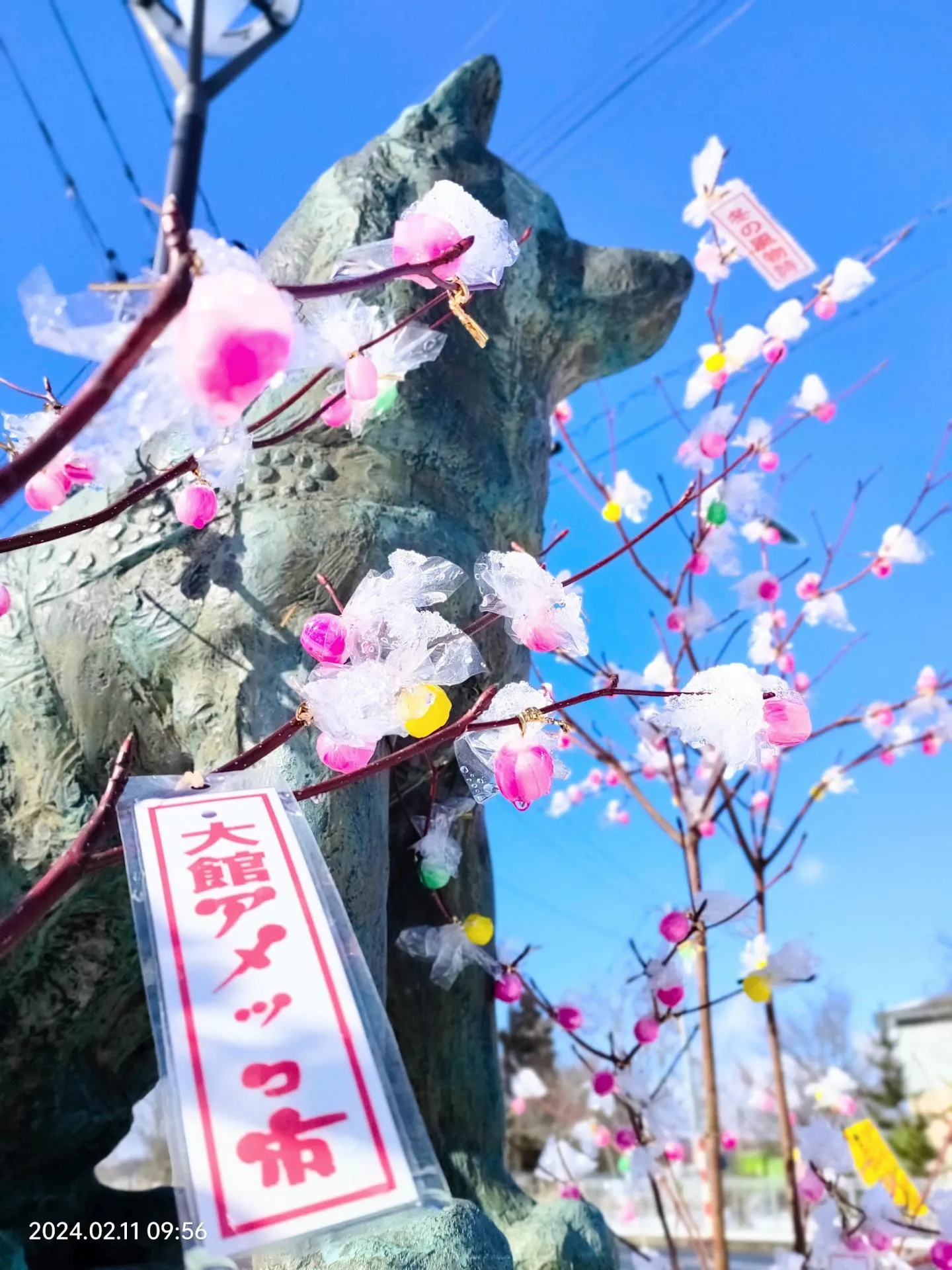 大館市観光交流施設「秋田犬の里」の前にある忠犬ハチ公像と飾りアメ。