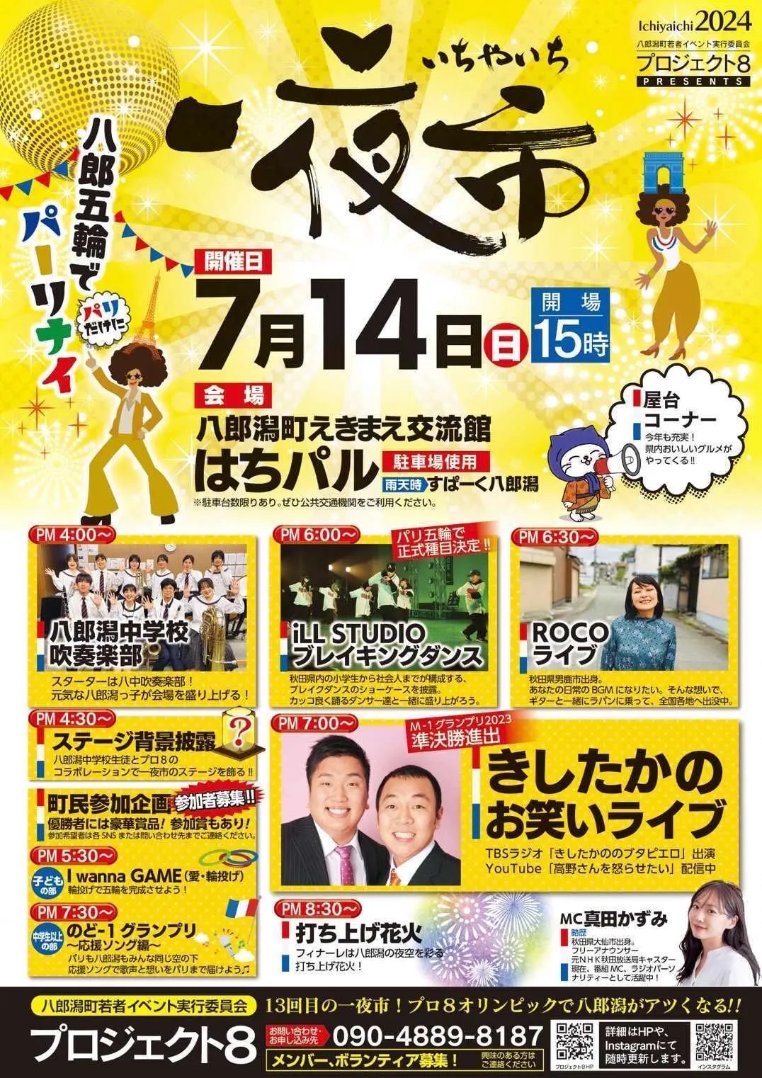 今年は7月14日(日)に「一夜市」が行われます。オリンピックイヤーとなる2024年は「八郎五輪でパーリナイ」と題し、間近に迫ったパリオリンピックやオリンピックに出場する町出身のバドミントン選手・志田千陽(しだ・ちはる)さんにちなんで、恒例のお笑いタレント登場のほか、さまざまなゲームやブレイキン(ブレイクダンス)などのステージイベント、応援ソング限定のカラオケ大会などを繰り広げる予定です。