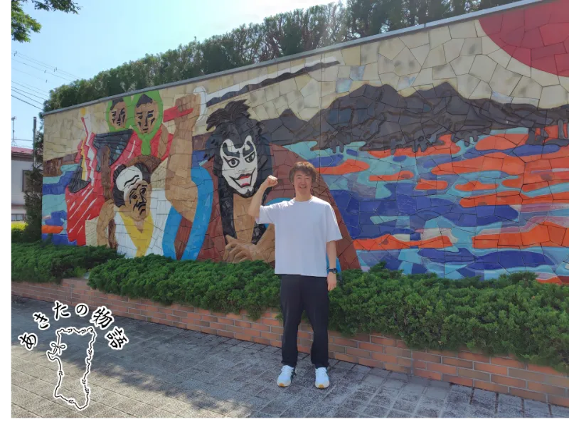 (プロジェクト8代表・佐藤さんと町の伝統芸能「願人踊(がんにんおどり)」のモニュメント(筆者撮影))