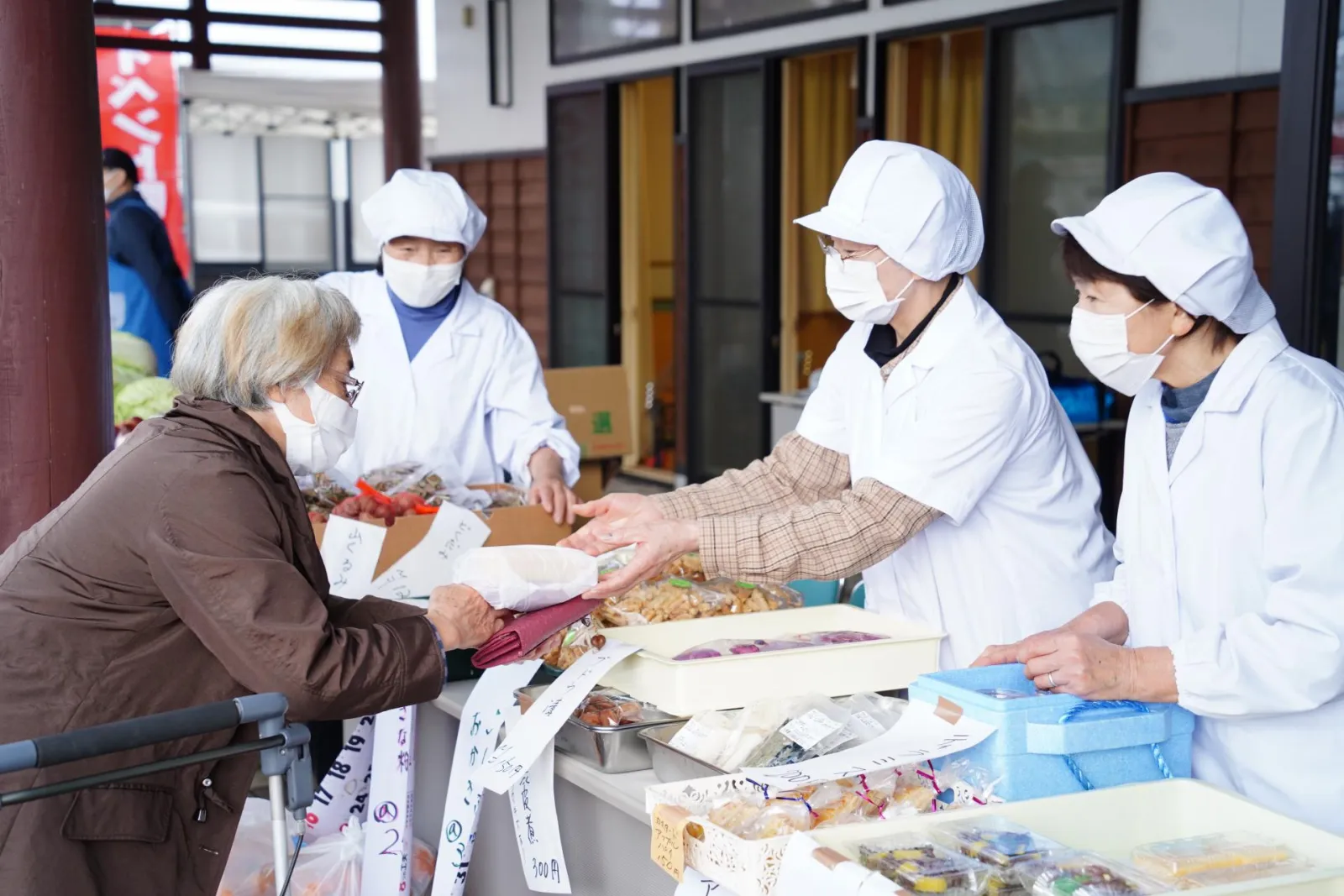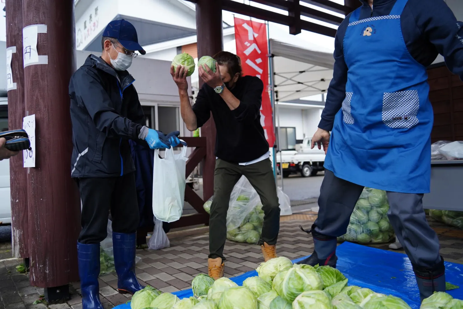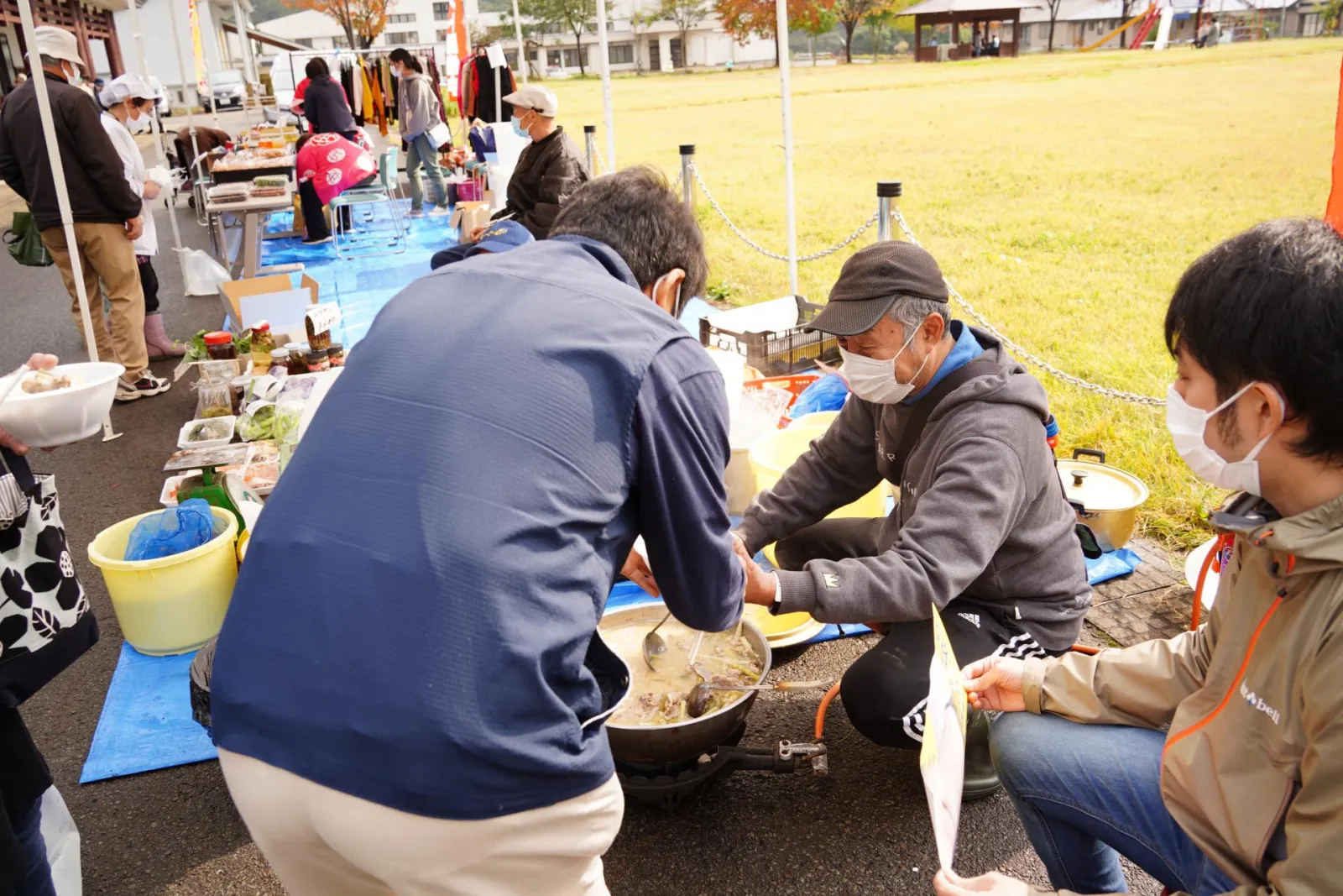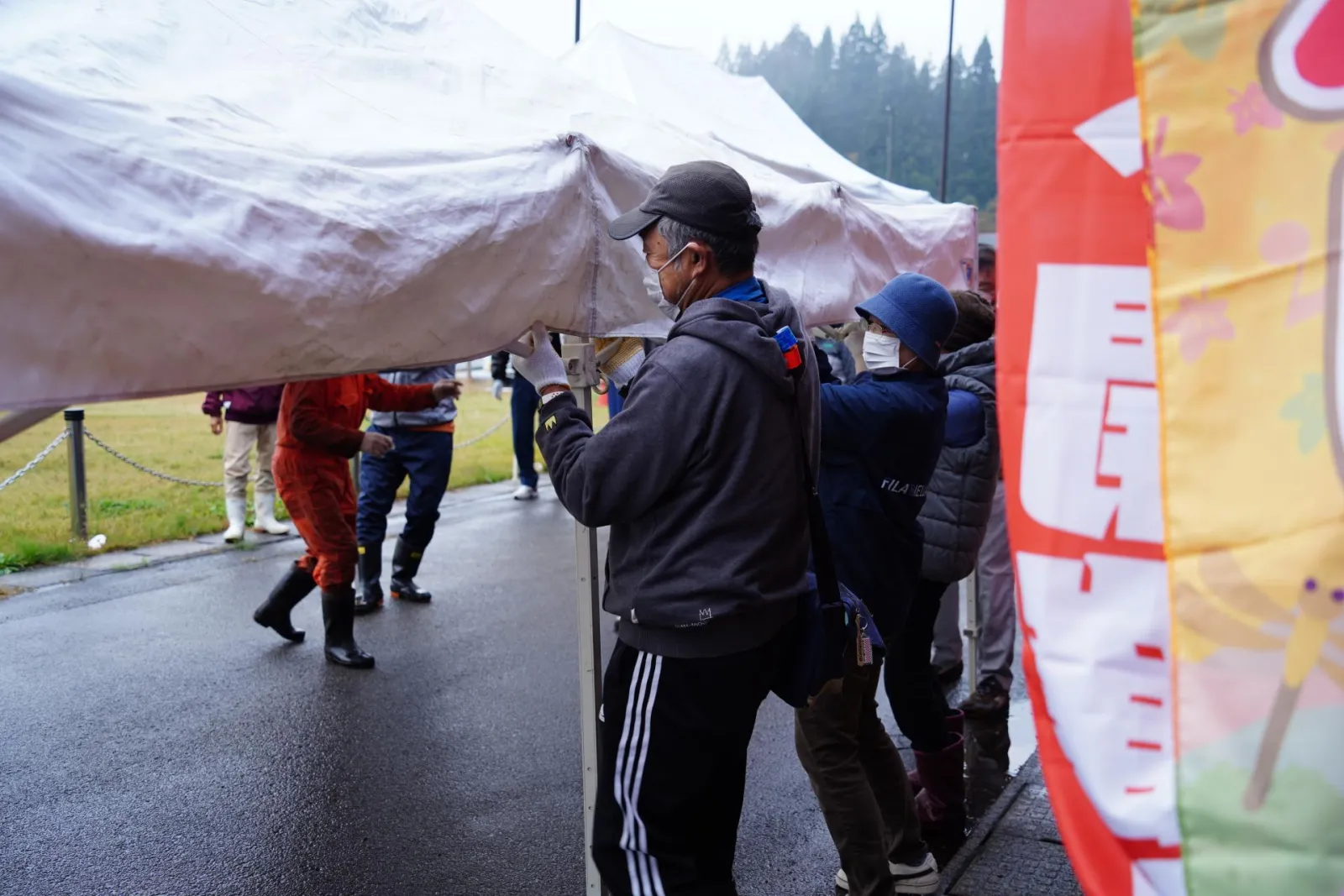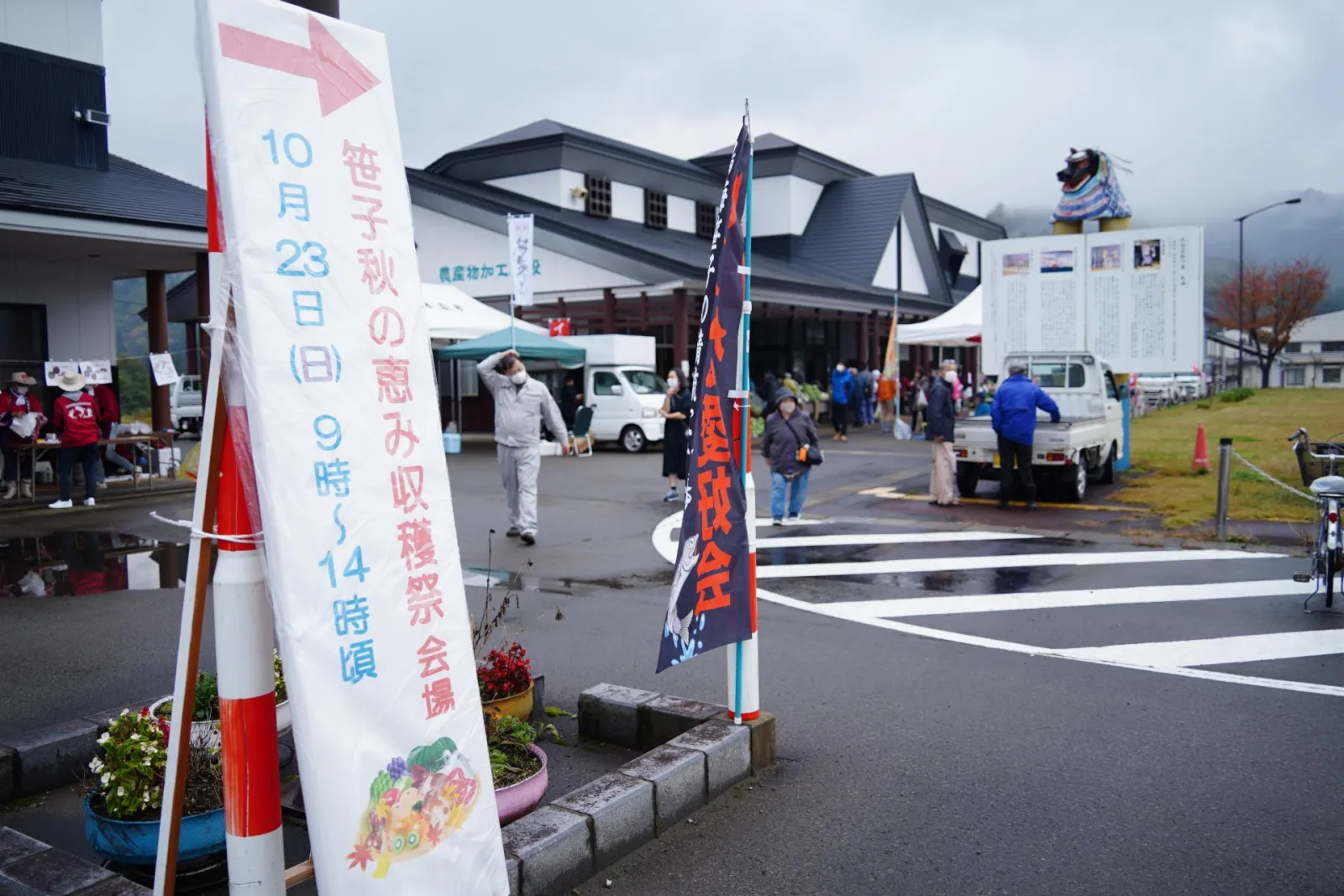 この日も朝から大雨の中、祭り準備が行われます。のぼりの準備をし、テントを立て、来場を促す看板を設置。開催時間が近づくと願いが通じたのか雨も止み、青空が見えるようになりました!ぞくぞくとお客様も来場し、開始時間前から賑わいをみせ3年ぶりとなる「笹子 秋の恵み収穫祭」の始まりです。