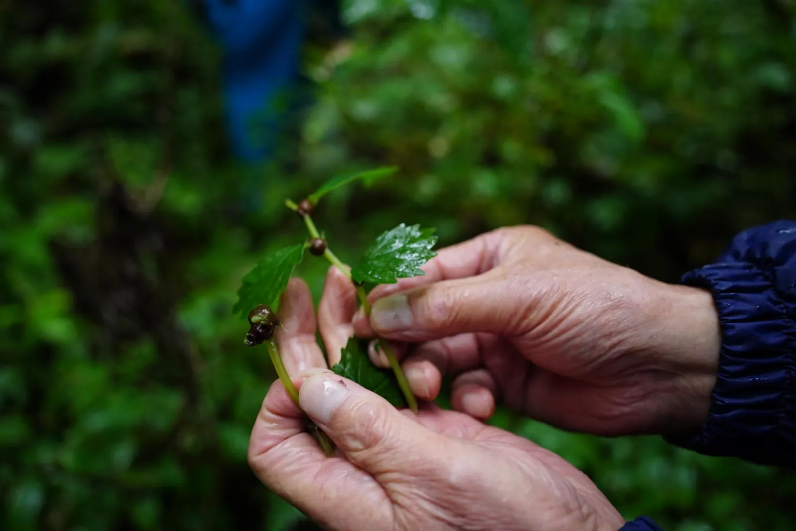 こちらは笹子に戻りまして、山内さんを筆頭に山の中へ。ミズの実の収穫です。笹子では「ぼんぼりっこ」と呼ばれているミズの実は3つ連なっているのが良いということで、佐々木さんも必死になって探しますが実が小さいのしか見つけられず…。「ほれっ!」と言って山内さんが持ってくるぼんぼりっこは大層大きいこと!さすが山の神!