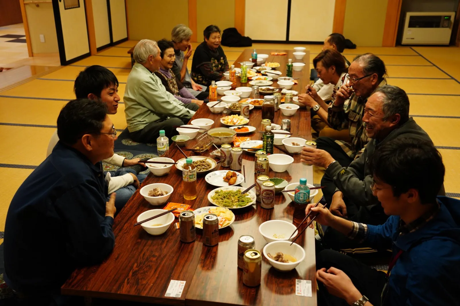 笹子公民館にて、山内さんと地元のお母さん方が手料理を作ってくれました!あけびの皮の味噌炒め、豪華な豚の骨付き肉やたけのこにミズが入ったガンド鍋などご馳走がたくさん!お料理が出来上がるまでは、山内さんが採取したワサビの下準備を全員で行いました。そして懇親会スタート!乾杯した後は沢山の話しに花が咲き、笑いが耐えない懇親会となりました。