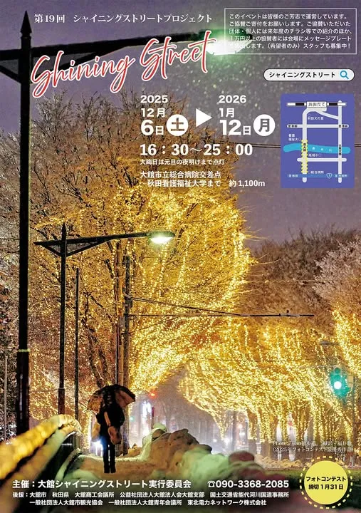 今年で19回目を迎える冬の風物詩「大館シャイニングストリート」は、約1kmにわたる幻想的な光の回廊です。地元で「22m道路」の愛称で親しまれる市道大館駅東大館線。市立総合病院交差点から秋田看護福祉大学正門までの区間、そして大館西大橋の街路樹83本がイルミネーションで飾られます。