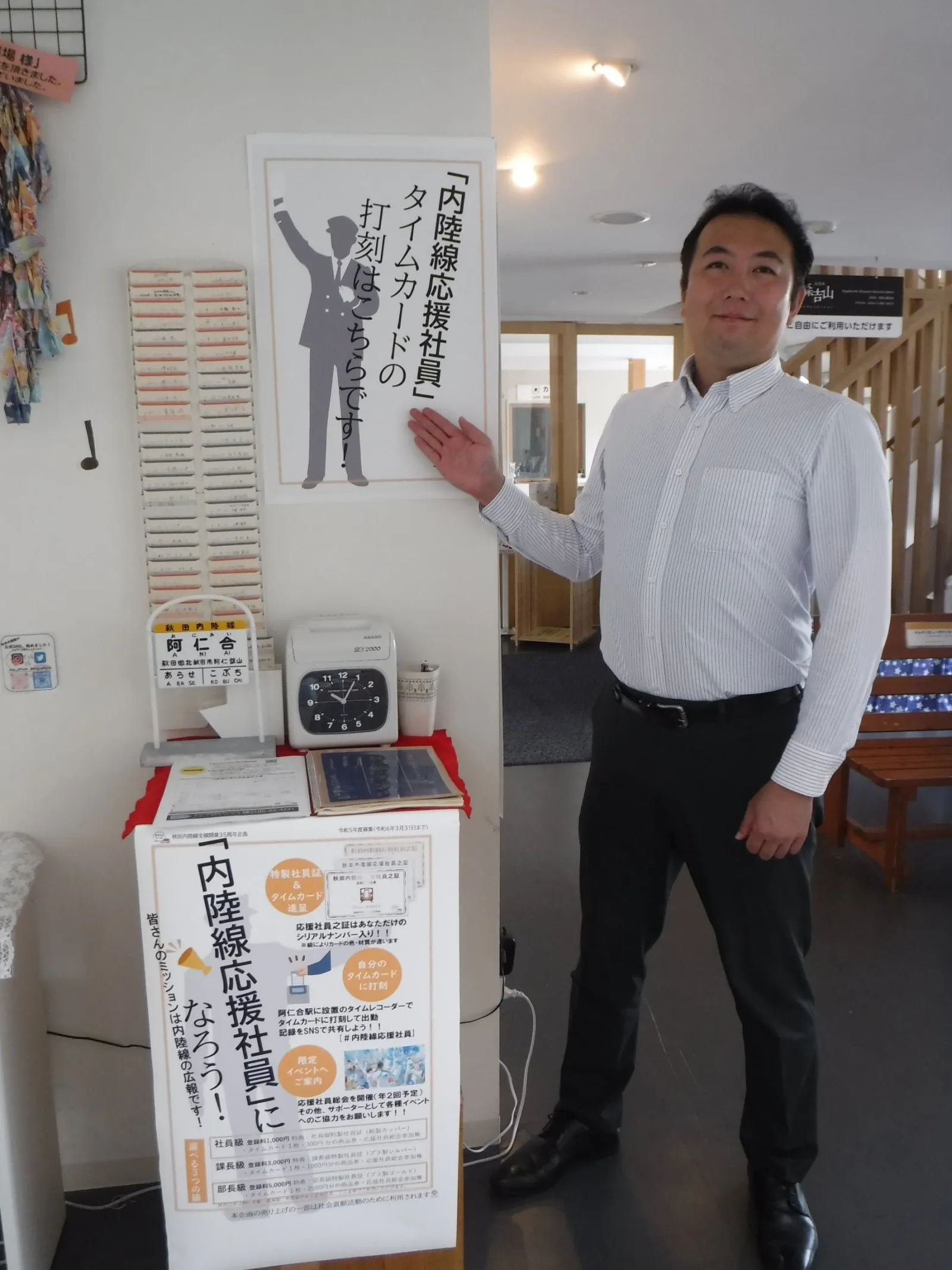 検討では、利用者の拡大には、内陸線のファンが大事だね、ファンを増やすには、ファンを惹きつける目的が必要だね、内陸線の情報発信は大事だからファンのミッションを広報にしよう、大事なミッションをお願いするのでサポーターより格をあげて応援社員と呼ぼう、社員ならタイムカードが要るね、タイムレコーダーはターミナルの阿仁合駅に置こう、ファンに自由に出勤体験してもらおうと話が進み、企画が実現しました。