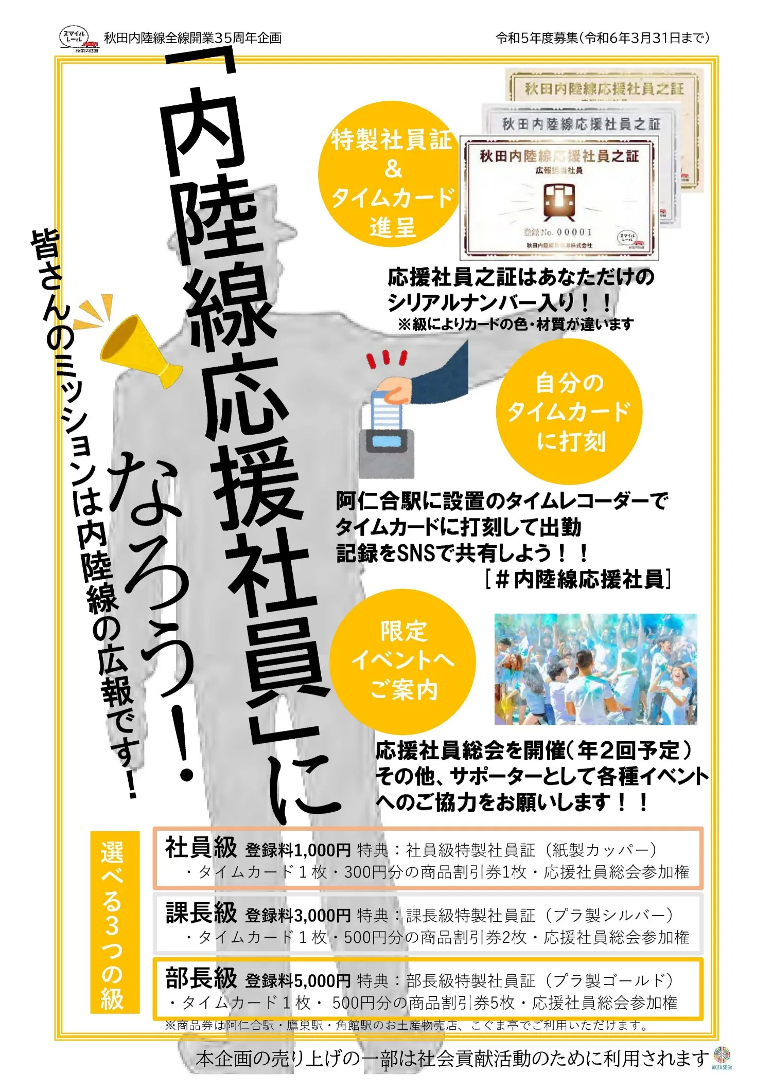 内陸線オンラインショップや阿仁合駅売店で申込ください。社員、課長、部長と等級があり、シリアルナンバー入りの社員証やタイムカード、商品券を進呈します。その際、内容に応じた登録料を頂きますのでご了承ください。