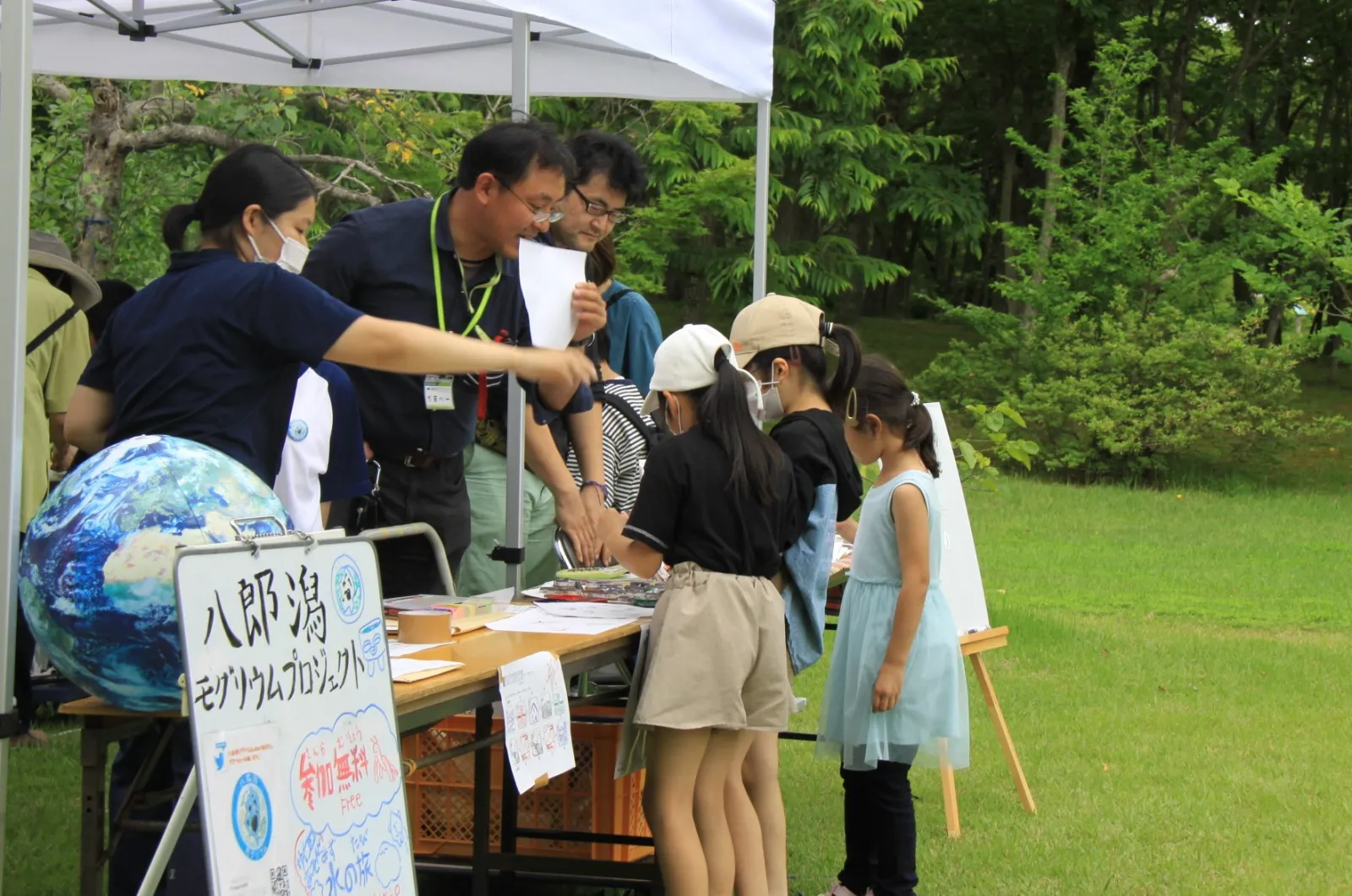 ※八郎湖の豊かな環境を観察することで、楽しみながら環境の再生を目指す、八郎潟モグリウムプロジェクトのメンバーと冨岡さん(ブース内右端)