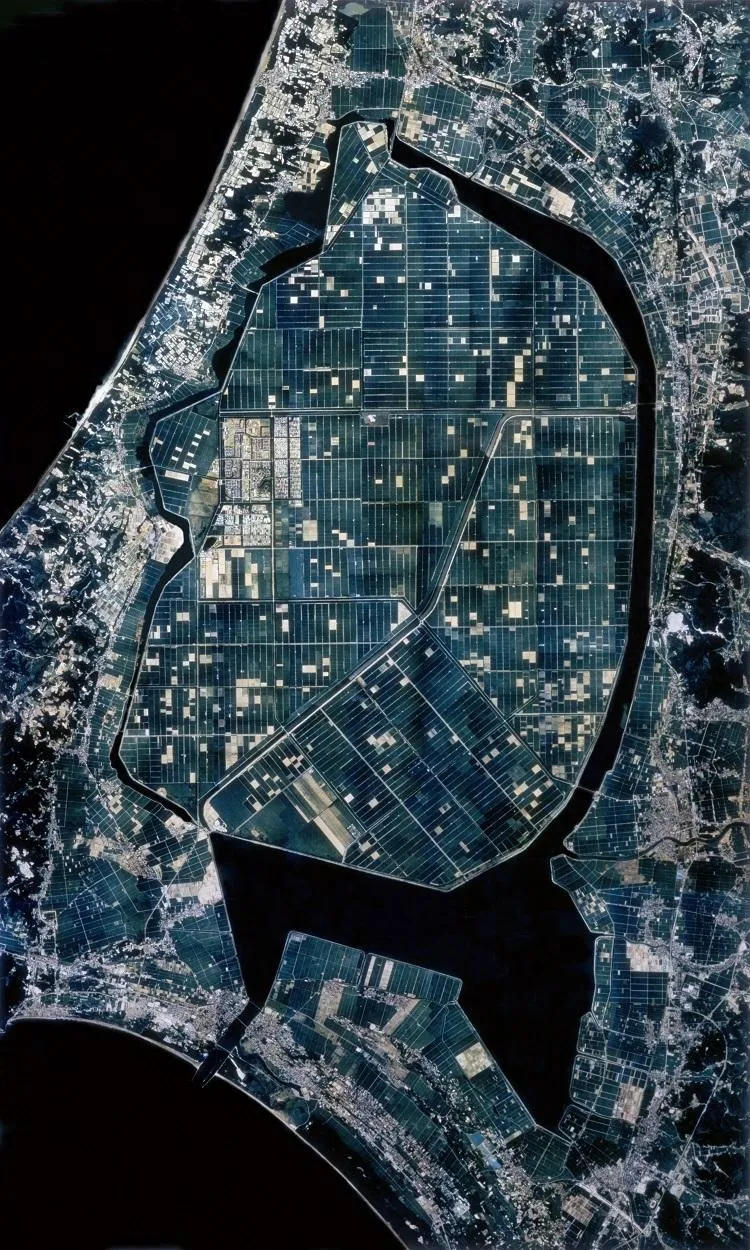 ※大潟村の衛星写真。周囲を調整池(八郎湖)として残し、その土地のほとんどが農地です。中央西部の一角690haの土地が総合中心地と呼ばれ、村民全員がここに住んでいます。