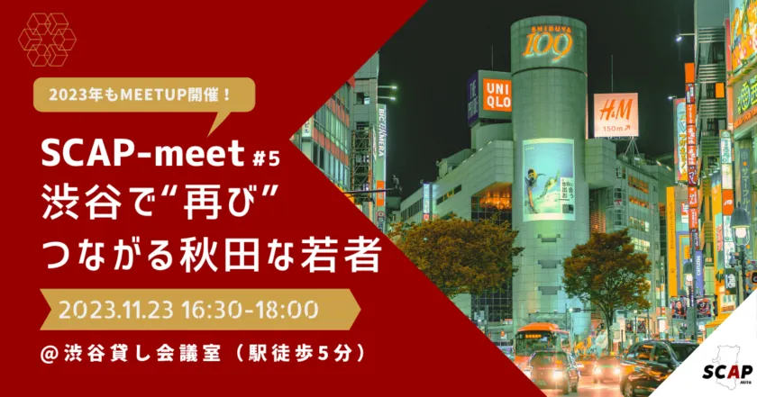 令和5年度秋田県首都圏等関係人口拡大イベント支援事業として、SCAP-Akitaが東京で行う関係人口拡大のイベント「SCAP-meet~東京渋谷で”再び”つながる秋田な若者~」がまもなく開催されます。